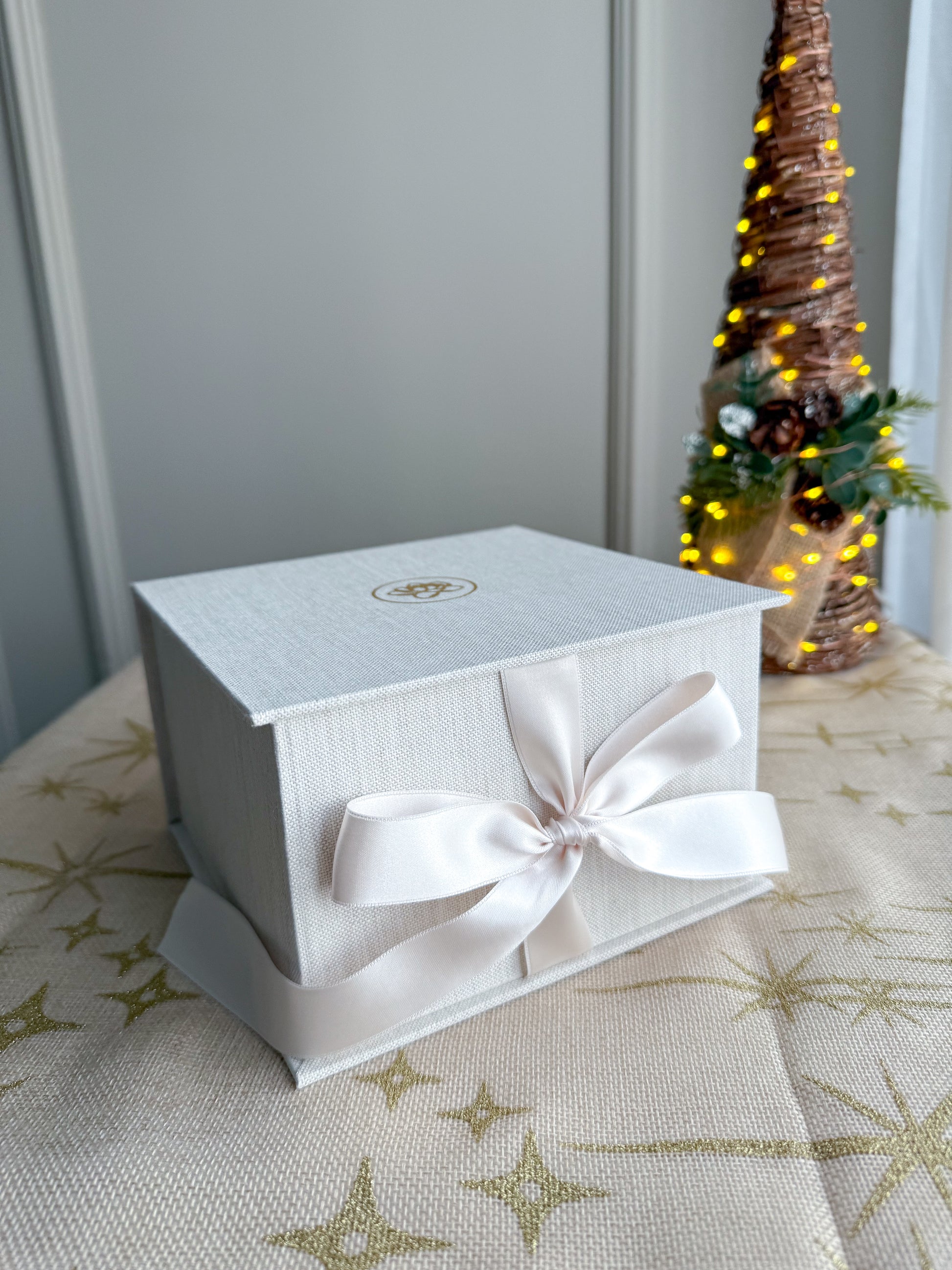 Vela Big Urso 600g (SEM PERFUME) em caixa de linho pérola personalizada em dourado e fita vanilla