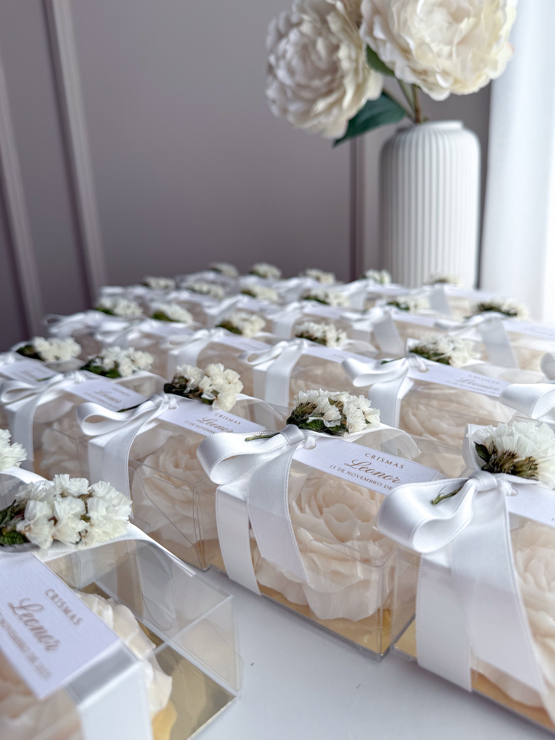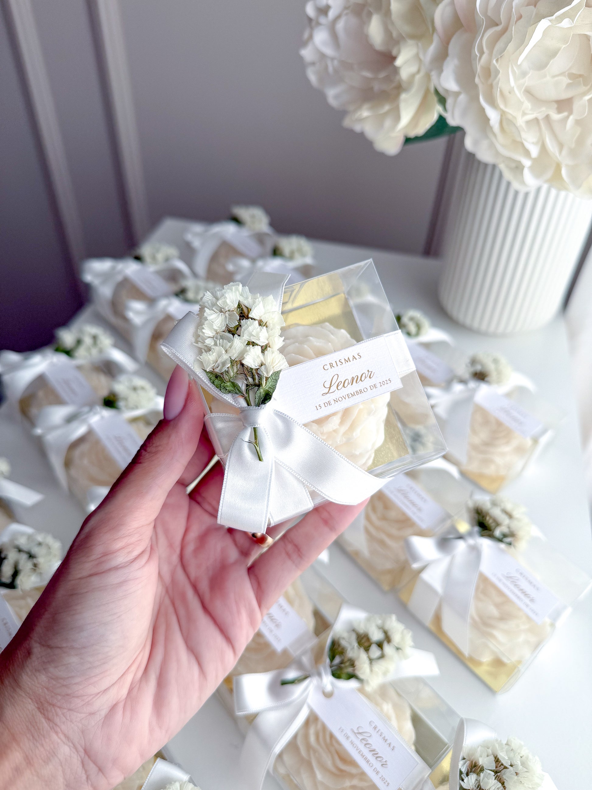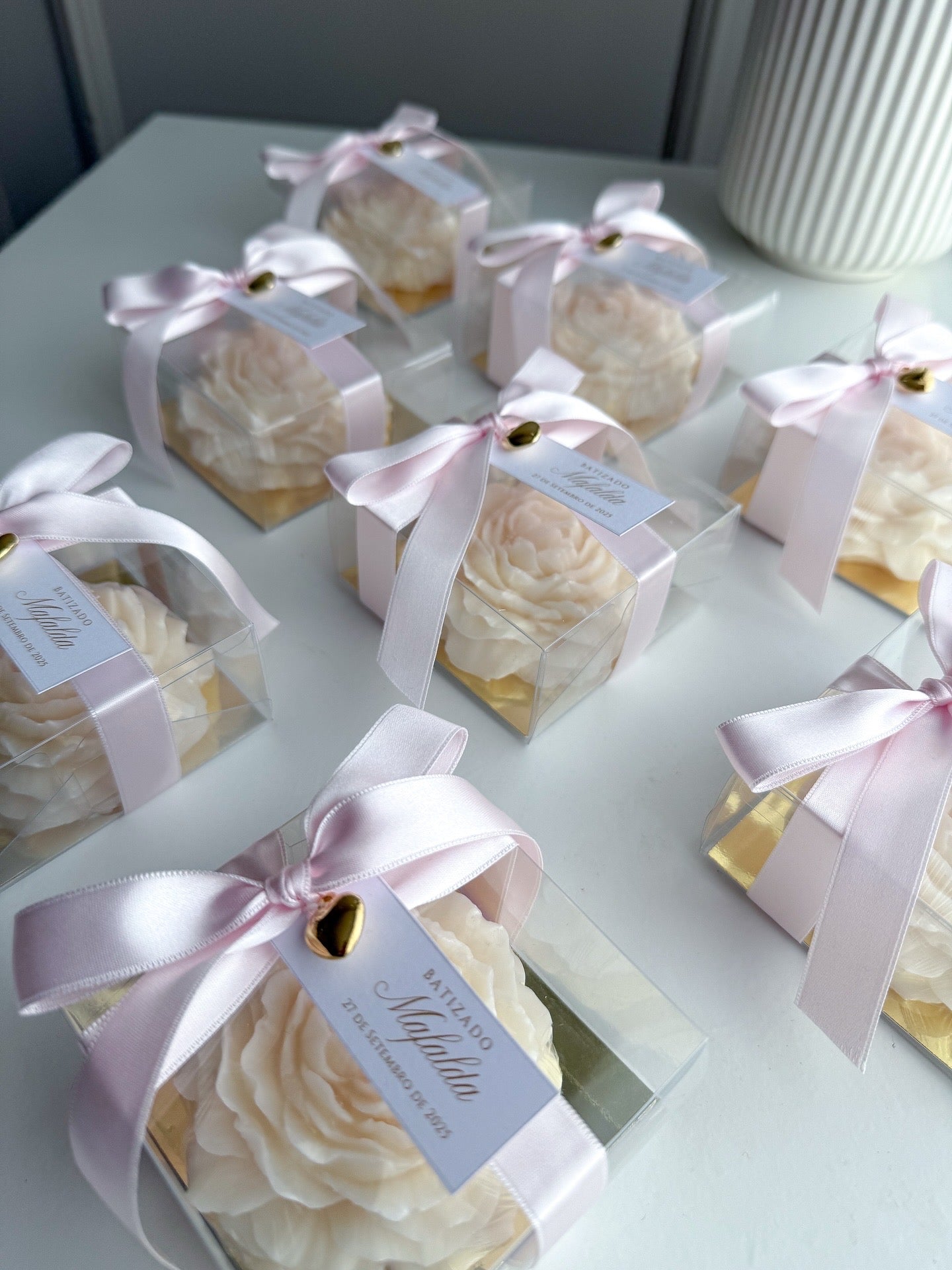 Embalada em caixa transparente de acetato, laço em fita e decoração a vossa escolha.