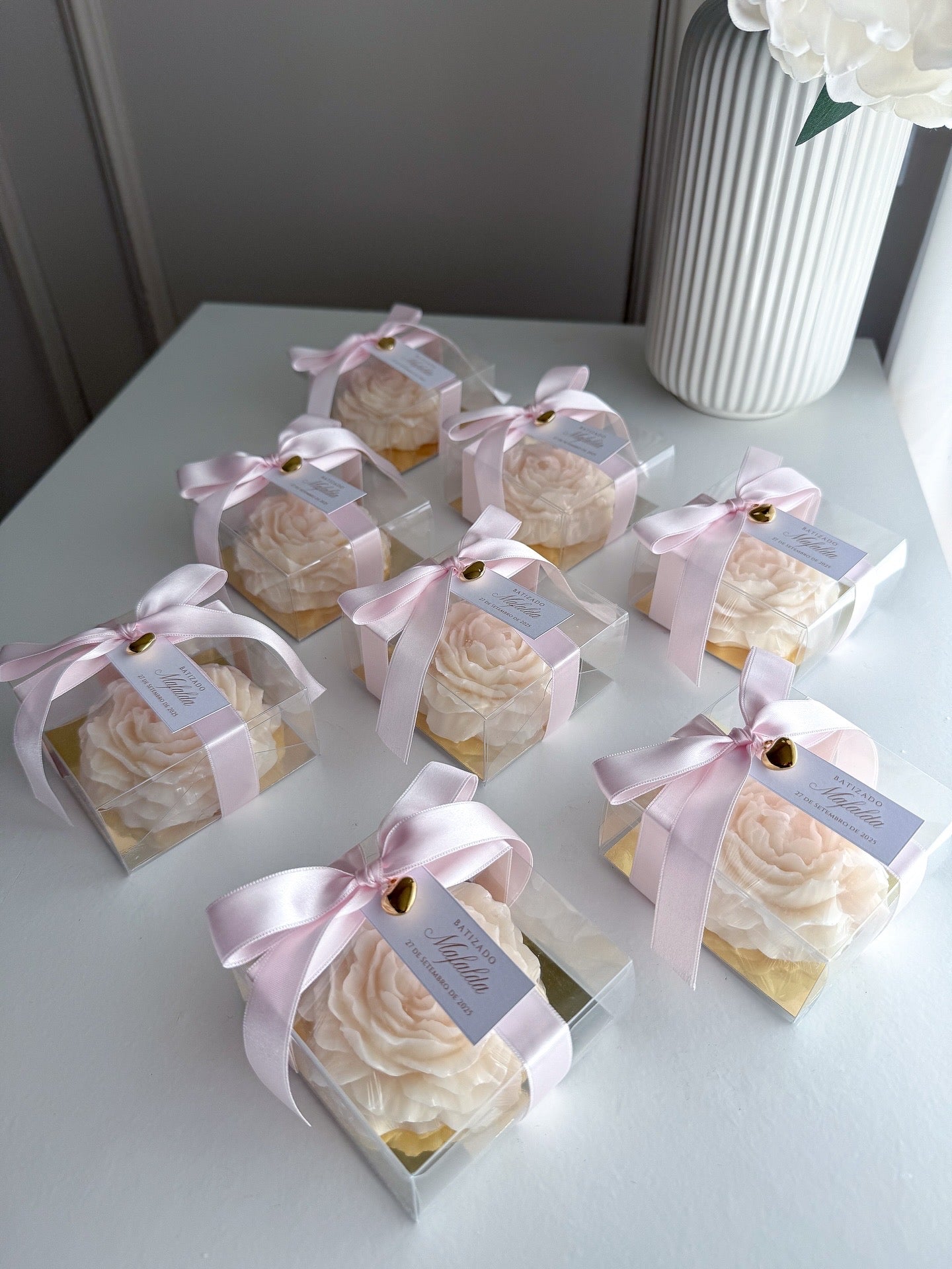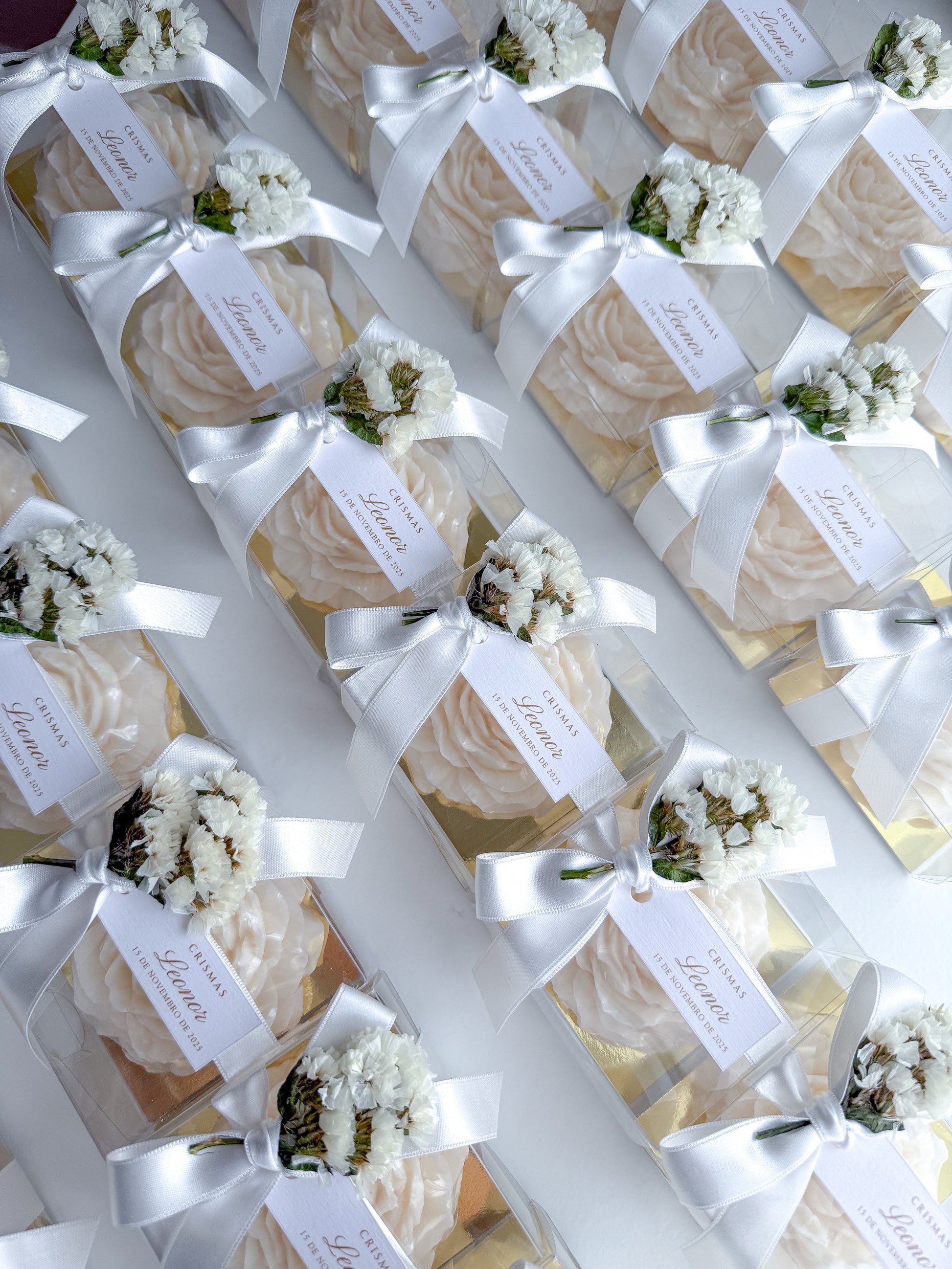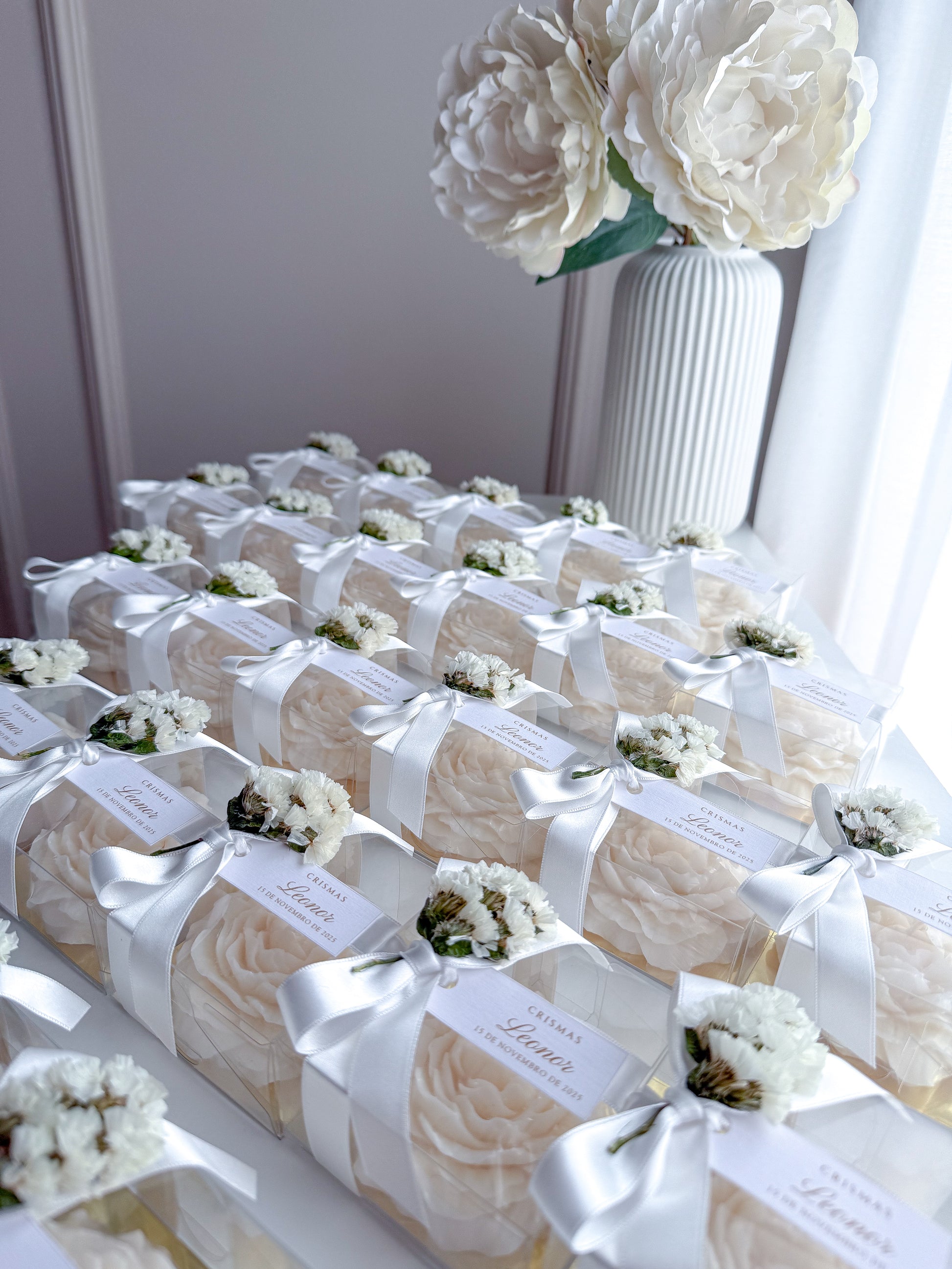 Embalada em caixa transparente de acetato, laço em fita e decoração a vossa escolha.