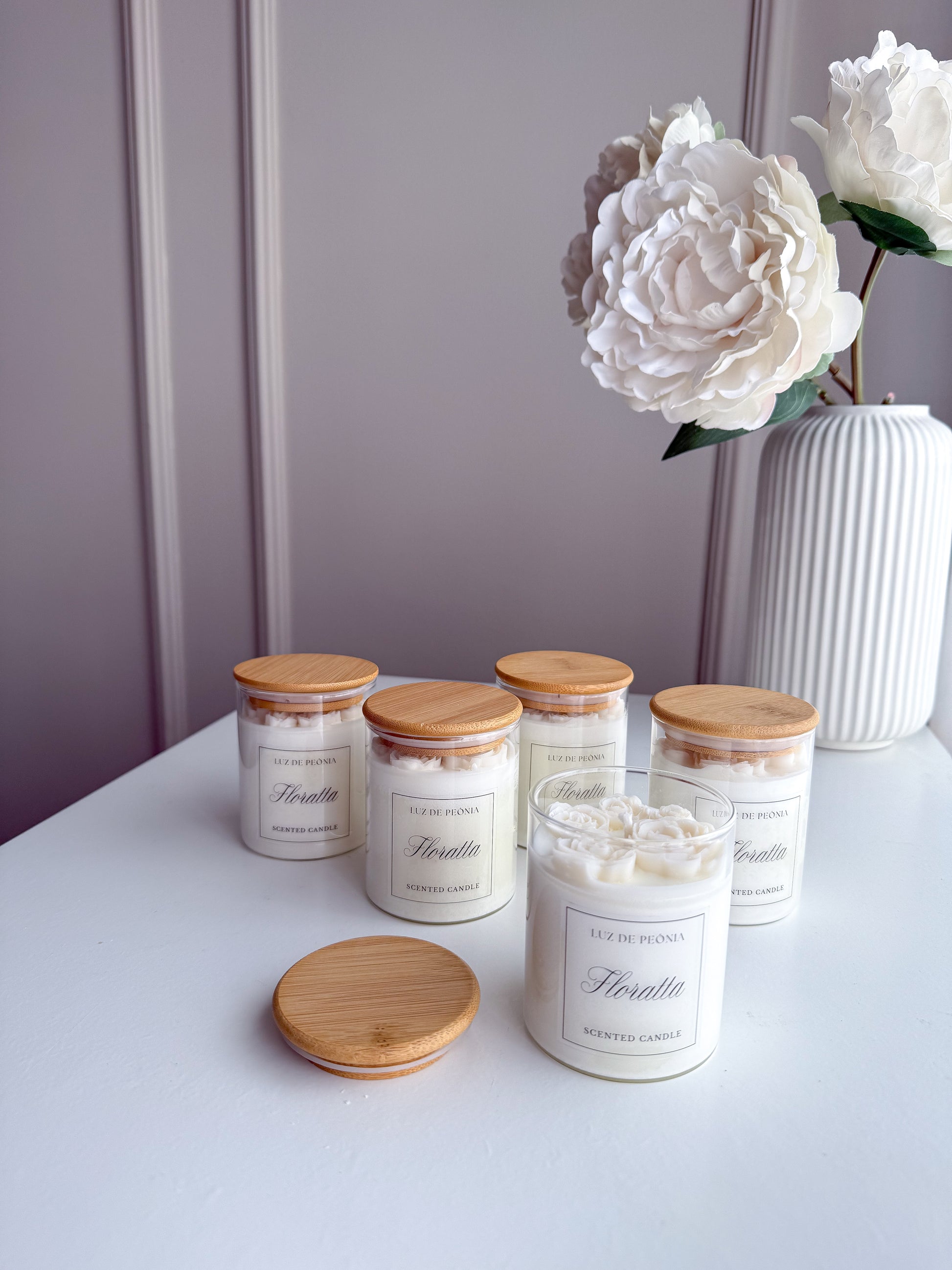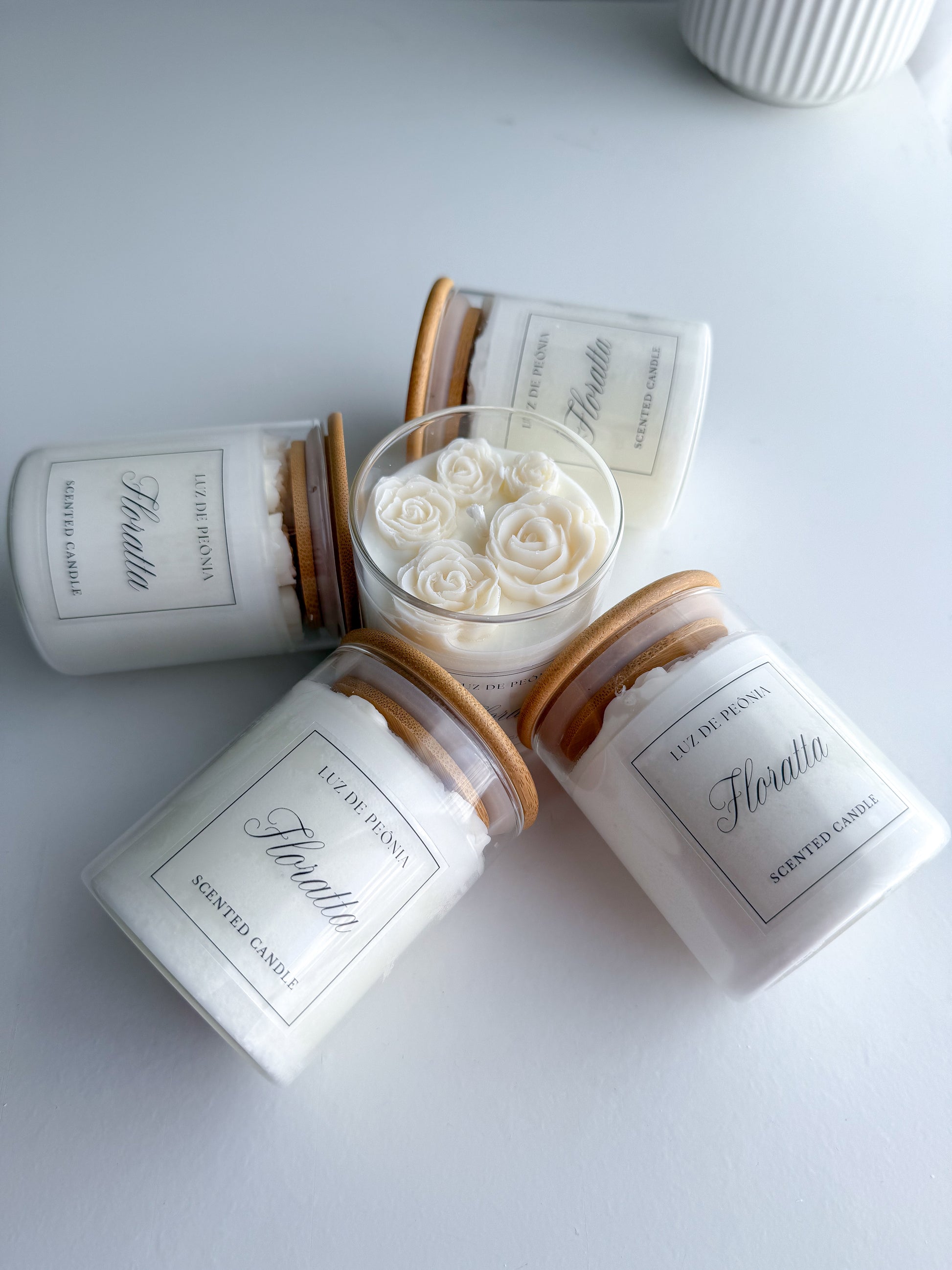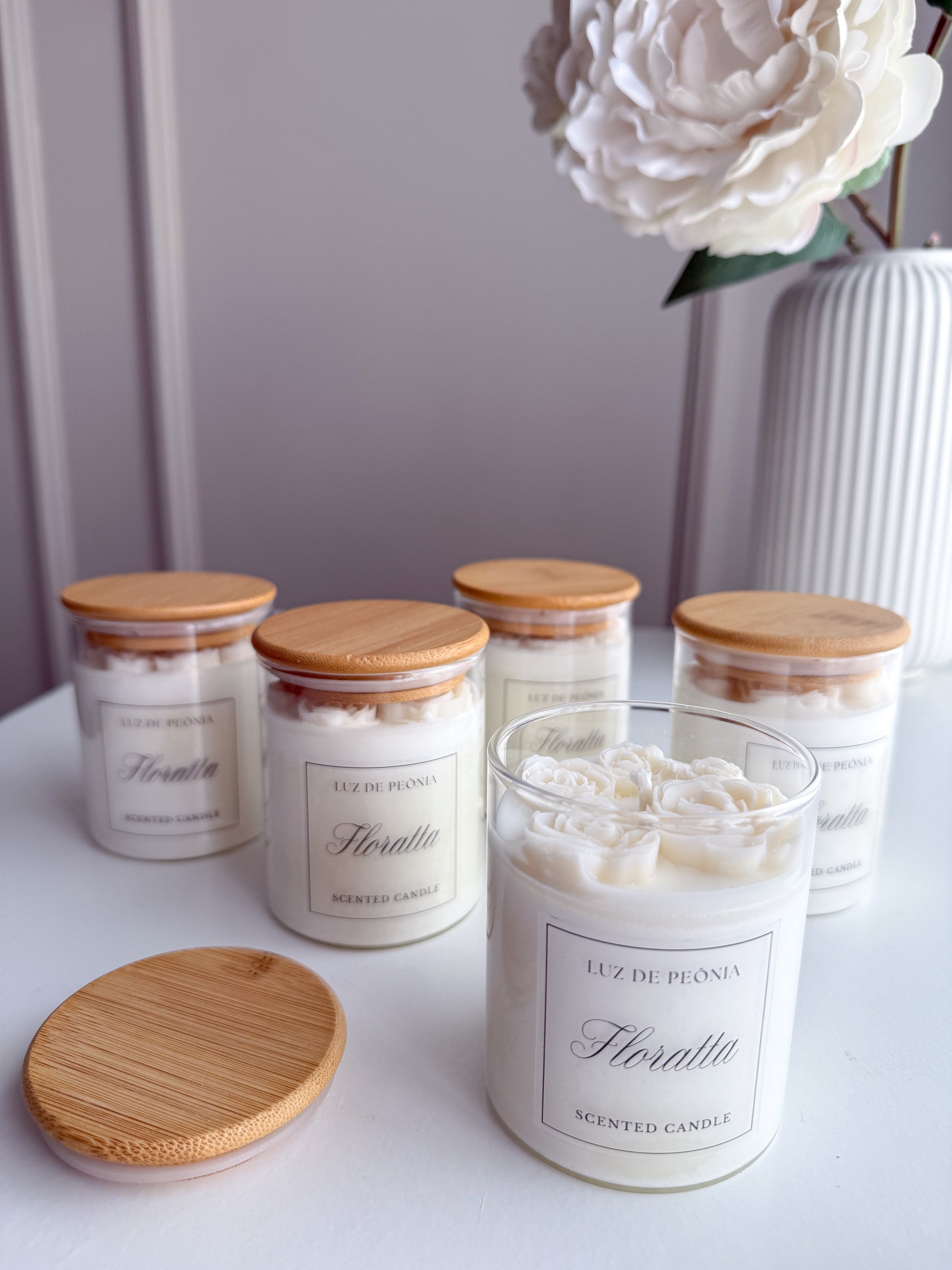 Nossa vela perfumada Floratta possui copo de vidro e tampa de madeira, decorada com o topo de flores é uma "mimosidade perfumada".